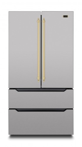 French Door de piso e de embutir, portas em inox escovado, puxador tubular em latão, com icemaker, capacidade de 636 litros com 91 cm de largura.
