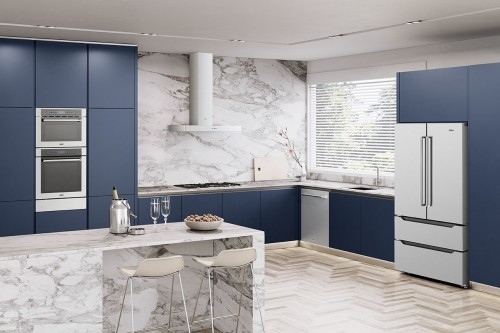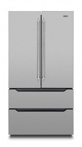 French Door de piso e de embutir, portas em inox escovado, puxador tubular em inox, com icemaker, capacidade de 636 litros com 91 cm de largura.