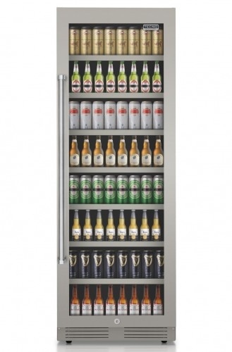As 7 prateleiras em aço com molduras frontais em aço escovado tem alturas reguláveis para acomodar garrafas e latas de todos os tamanhos e também barris de 5 litros.