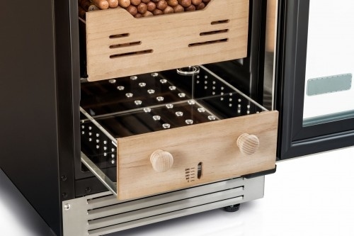A prateleira e as amplas gavetas para charutos soltos são feitas a mão e utilizam puro cedro espanhol que mantém a umidade estável e previne a ocorrência de parasitas proporcionando um perfeito amadurecimento dos charutos.