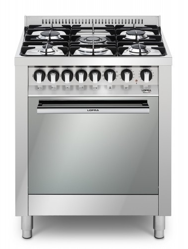 em inox polido, de piso e de embutir, 5 queimadores a gás, forno elétrico ventilado de 10 funções com churrasqueira, timer e largura de 70 cm.