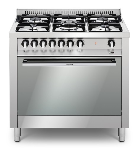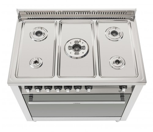 em inox polido, de piso e de embutir, 5 queimadores a gás, forno elétrico ventilado de 10 funções com churrasqueira, timer e largura de 90 cm.