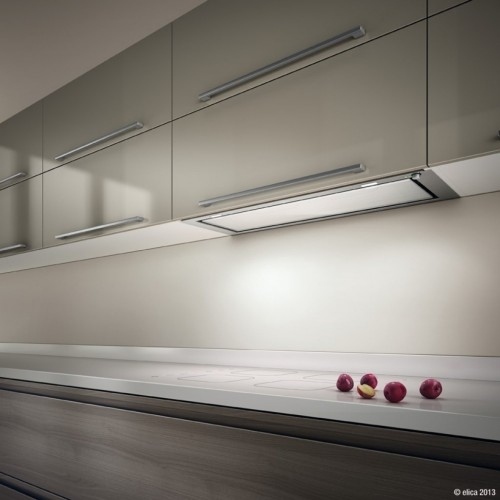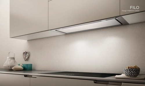 A coifa Filo pode ser embutida em móveis sem puxadores por ter seu painel frontal recuado na parte inferior, o que permite a abertura das portas do armário com as mãos.