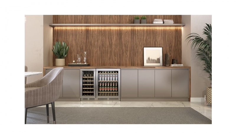 Para proporcionar um ambiente gourmet moderno e minimalista, as prateleiras da BEER CENTER, são cromadas com a frente em madeira, combinando com a Adega da Debacco.