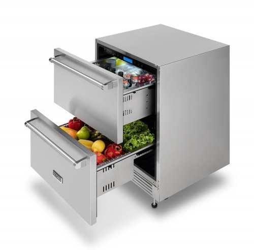 As duas gavetas somam uma capacidade de 136 litros e possuem divisórias internas em aço para acomodar diferentes embalagens e uma exclusiva cesta para frutas.