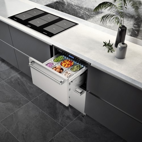 A gaveta refrigerada TR14 GXDA compõe elegantes conjuntos com os demais produtos da linha Tecno Professional com os mesmos puxadores tubulares em inox.
