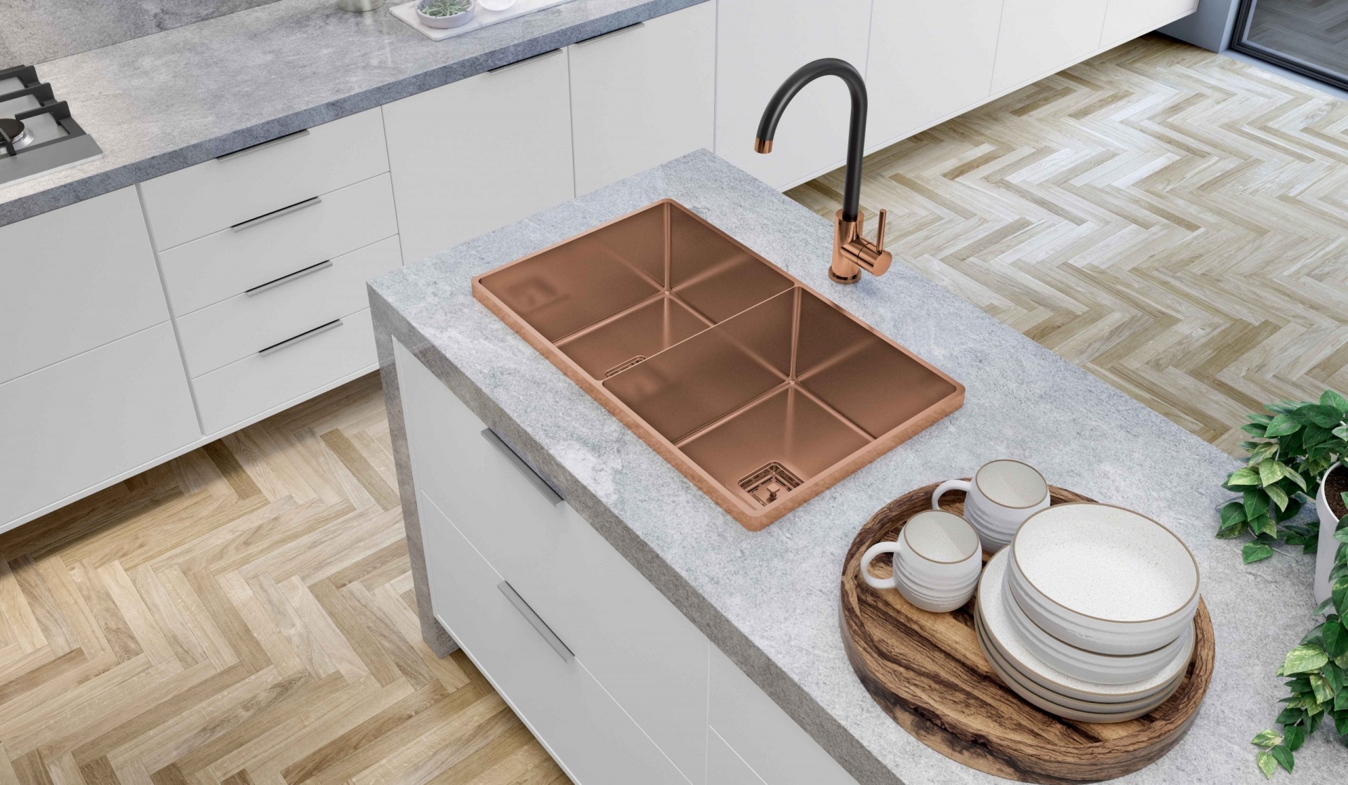 A CUBA PRIMACCORE DUPLA SEMI TOPMOUNT em aço inox de 1.0 mm, deixa um projeto de cozinha de “estar” elegante e moderna.