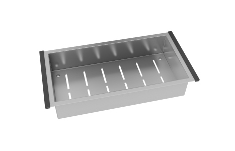 que permitem o escoamento da água. A BANDEJA RETANGULAR PROFUNDA pode ser utilizada para higienizar frutas, bem como acomodar utensílios após serem higienizados.