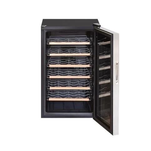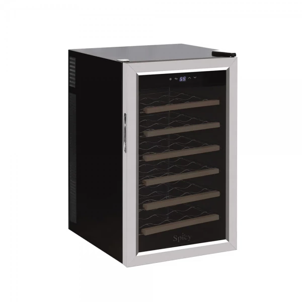Um grande diferencial das adegas Spicy é a frente de vidro com borda em aço inox e suas clássicas prateleiras.