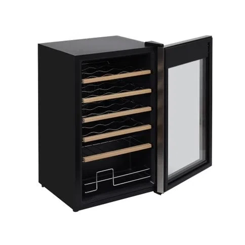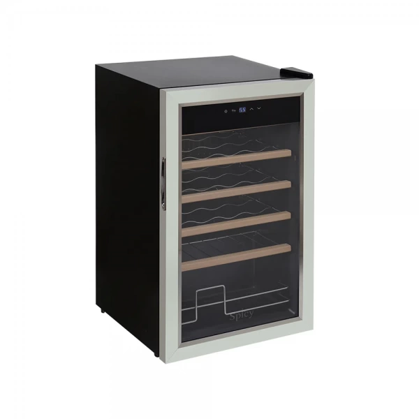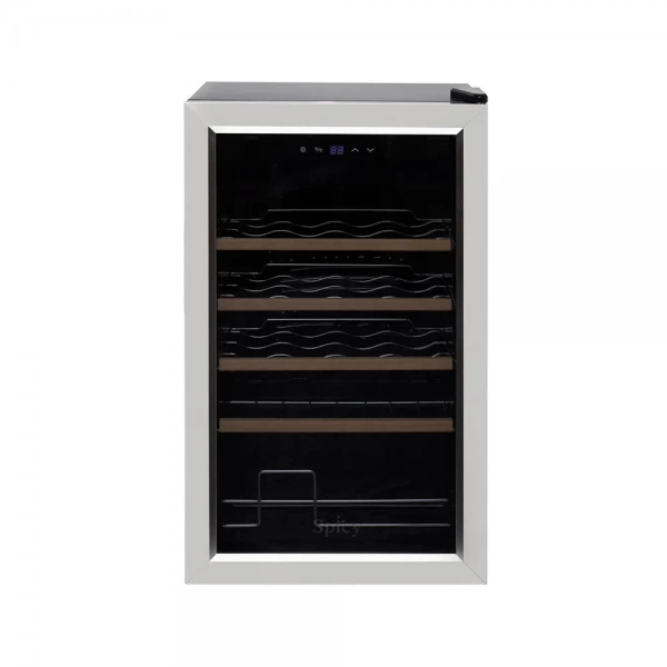 Um grande diferencial das adegas Spicy é a frente de vidro com borda em aço inox e suas clássicas prateleiras.