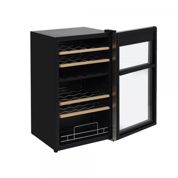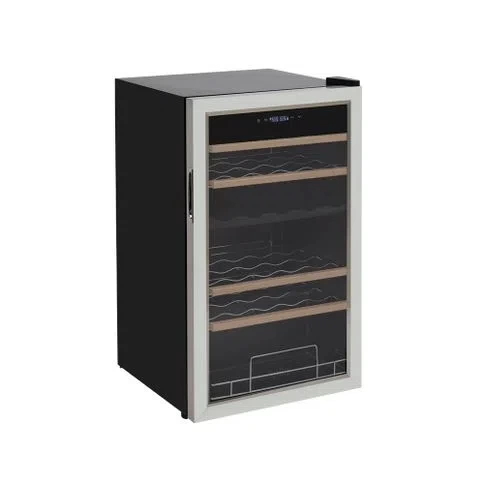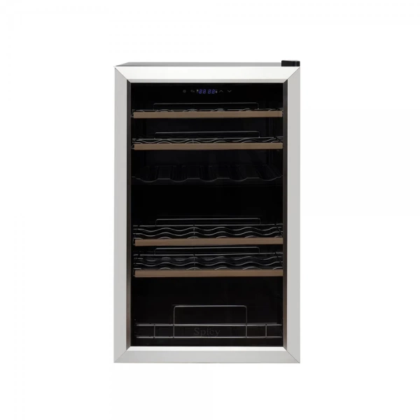 Um grande diferencial das adegas Spicy é a frente de vidro com borda em aço inox e suas clássicas prateleiras.