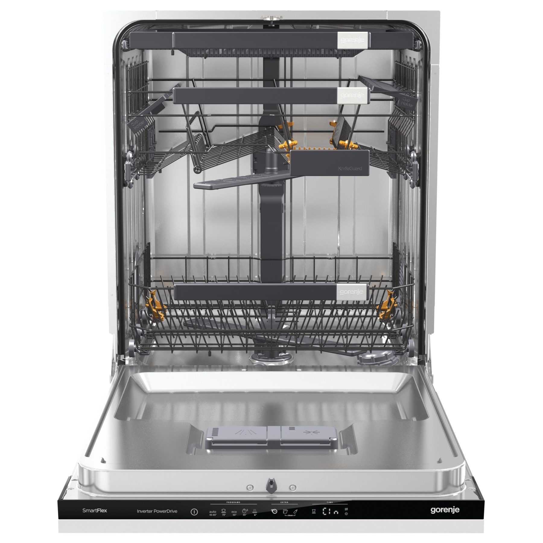 Cesto superior: Base com trama larga; Puxador com logotipo de plástico; Prateleira dobrável - esquerda; Prateleira dobrável - direita; Suporte para facas grandes; Um suporte dobrável